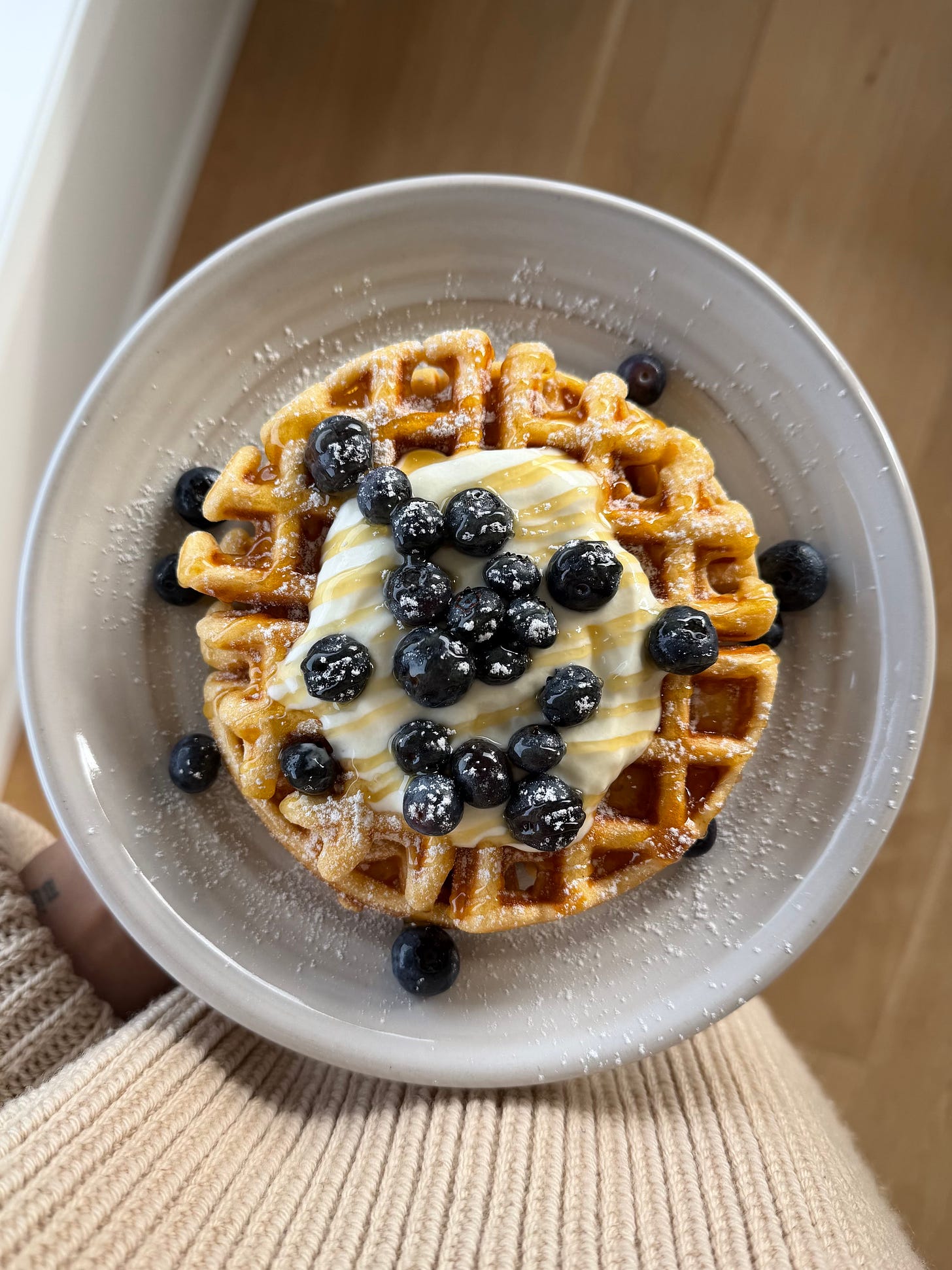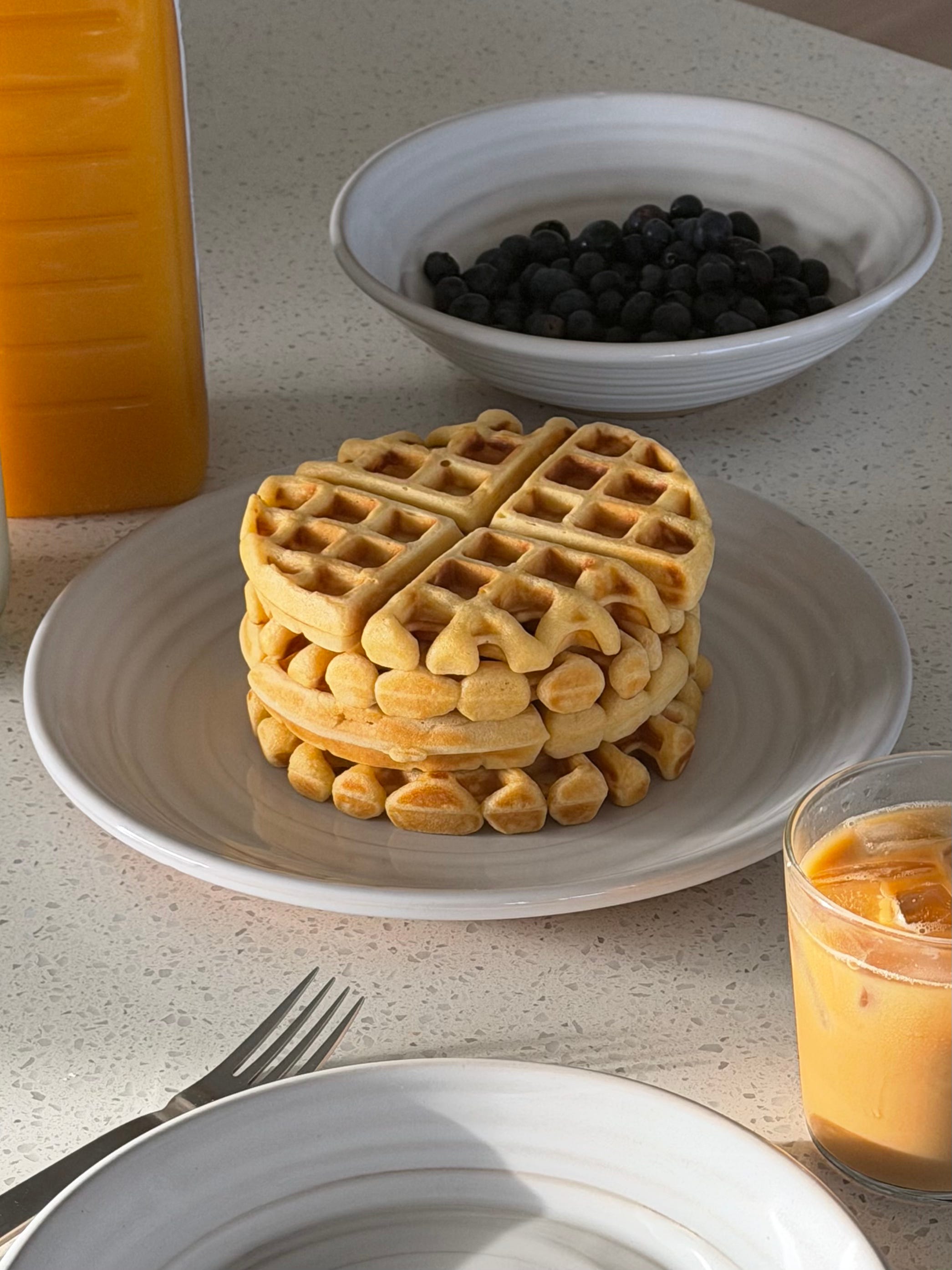 My husband started a tradition to make me waffles for breakfast on my birthday every year. He wakes up really early and sneaks out of bed to bake them in the kitchen, and it is my favorite thing. I love waffles, maybe even more than I love pancakes. I love thin waffles, chewy waffles, crispy waffles, Belgian waffles, Stroopwafel, you name it. I do like to save them for a special occasion ( also, the waffle maker is always tedious to clean up ). It's a good thing today is Christmas; I think we've got ourselves a new tradition!